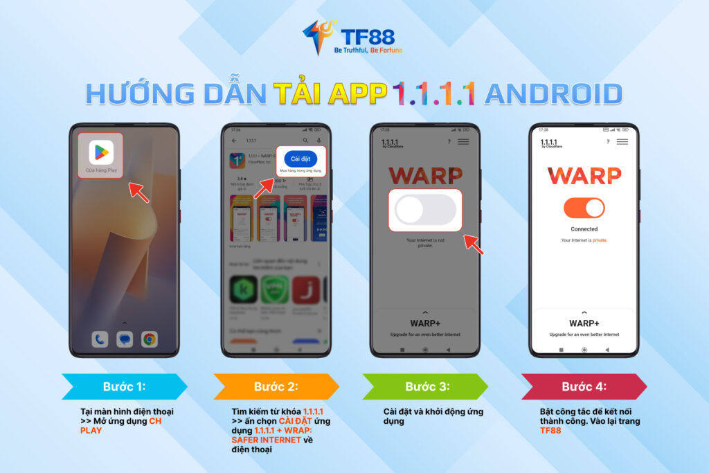 Vui lòng truy cập App Store hoặc CH Play để tải ứng dụng 1.1.1.1 được phát triển bởi công ty Cloudflare, Hoa Kỳ hay còn được biết đến tới với tên WARP giúp bạn thay đổi DNS, địa chỉ IP và dễ dàng truy cập vào các trang web bị chặn bởi nhà mạng, hoàn toàn miễn phí và bảo mật thông tin người chơi tuyệt tối. Vui lòng làm theo hướng dẫn.
